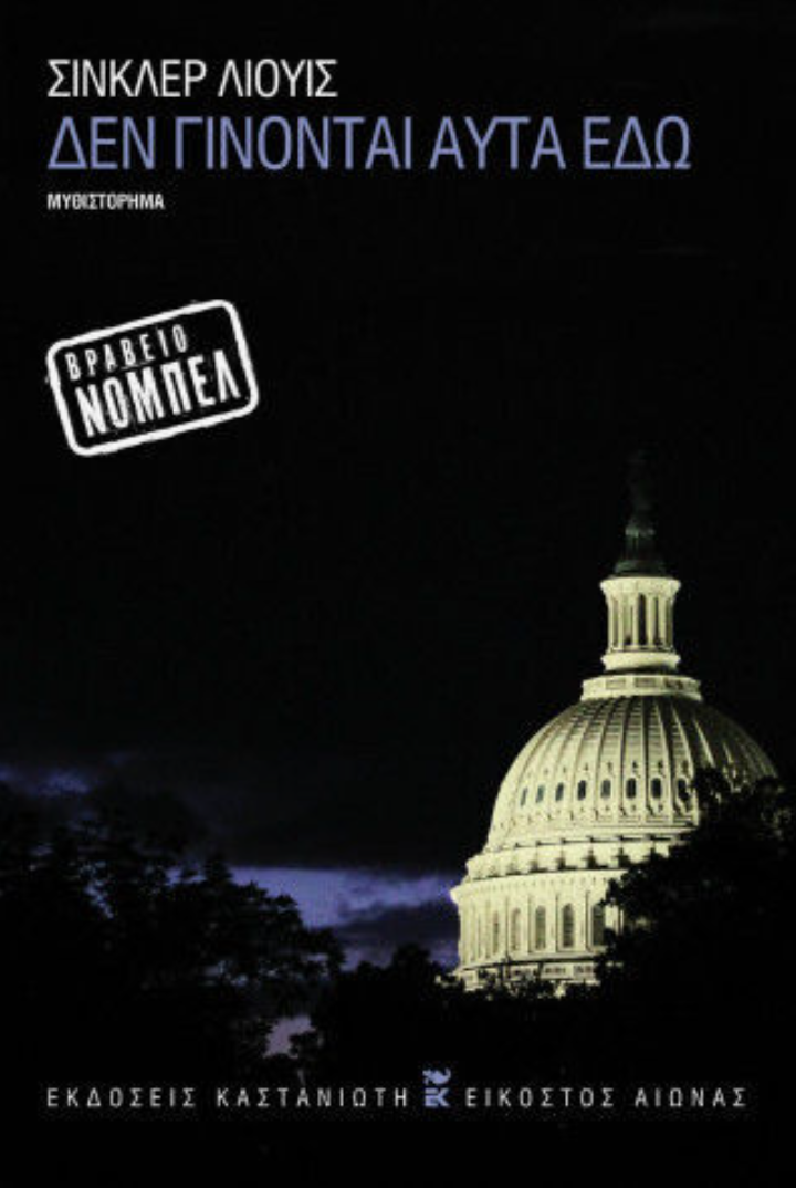 Αυτό το βιβλίο του Σίνκλερ Λιούις είναι μια λογοτεχνική προειδοποίηση για την εύθραυστη φύση της δημοκρατίας. Περιγράφει πώς ο ολοκληρωτισμός μπορεί να επικρατήσει στις ΗΠΑ, με μια διορατική ματιά που προκαλεί αγωνία στον αναγνώστη. Κύριοι ήρωες είναι ο δημοσιογράφος Ντορέμους Τζέσαπ και ο δημαγωγός γερουσιαστής Μπαζ Γουίντριπ, που ιδρύει ένα φασιστικό καθεστώς βασισμένο στη βία. Το μυθιστόρημα "Δεν γίνονται αυτά εδώ" είναι μια πολιτική σάτιρα που εξελίσσεται σε δυστοπία, όπου ένας εκλεγμένος πρόεδρος γίνεται δικτάτορας για να «σώσει» το έθνος.
